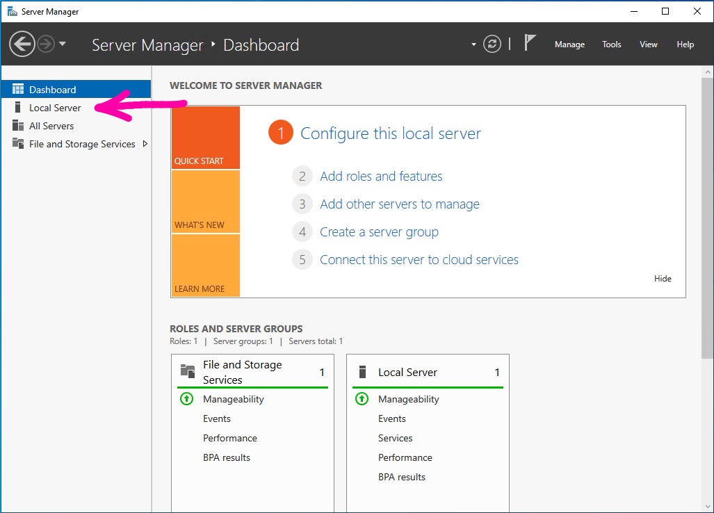 - Open Server Manager (it usually opens automatically on login; otherwise, search for it in the Start menu).
