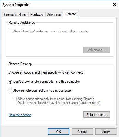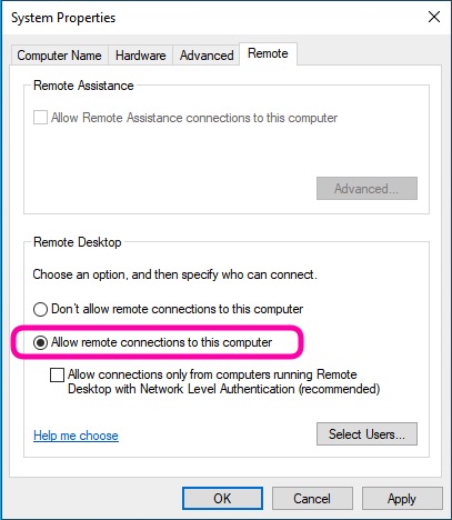 - For enhanced security, check the box for Allow connections only from computers running Remote Desktop with Network Level Authentication (recommended).
